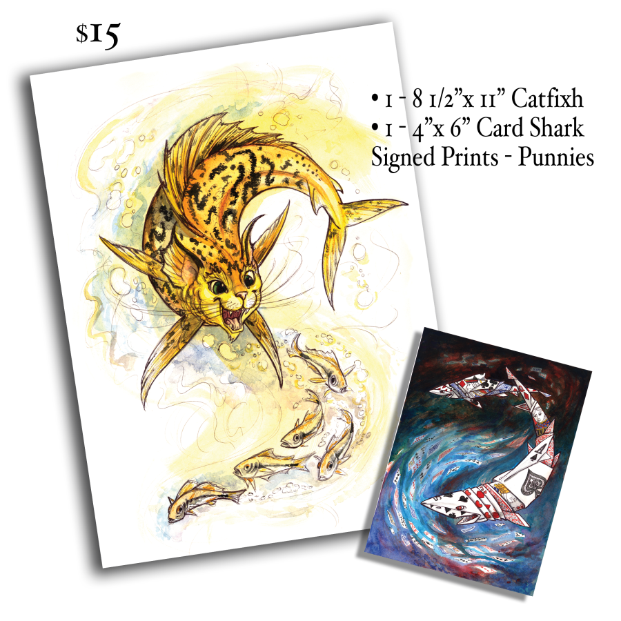 Two prints originally printed as a bonus for The Punnies Kickstarter project. each print is signed and limited to a run of 500 pieces. the Catfish is 8 x10" and the Card Shark is 4"x 6". Great as a gift; keep one for yourself and pass the other to friend.